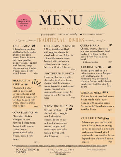 { "@context": "https://schema.org", "@type": "Restaurant", "name": "Casa Tequilana", "address": { "@type": "PostalAddress", "streetAddress": "545 N Main St #9", "addressLocality": "Leeds", "addressRegion": "UT", "postalCode": "84746", "addressCountry": "US" }, "telephone": "+1-435-703-6204", "openingHours": [ "Sun 10:00-14:00", "Mon 16:00-20:00", "Tue 16:00-20:00", "Wed 16:00-20:00", "Thu 16:00-20:00", "Fri 16:00-20:00", "Sat 11:30-21:00" ], "cuisine": "Mexican", "description": "Casa Tequilana offers authentic Mexican cuisine with delicious dishes like brisket tacos, smothered burritos, and fresh aguas frescas in Leeds, UT.", "menu": "https://order.toasttab.com/online/casa-tequilana-545-n-main-st", "image": "https://www.casatequilana.com/index_htm_files/15677.png", "url": "https://www.casatequilana.com/", "sameAs": [ "https://www.instagram.com/casatequilana/", "https://www.facebook.com/casatequilana/" ] }