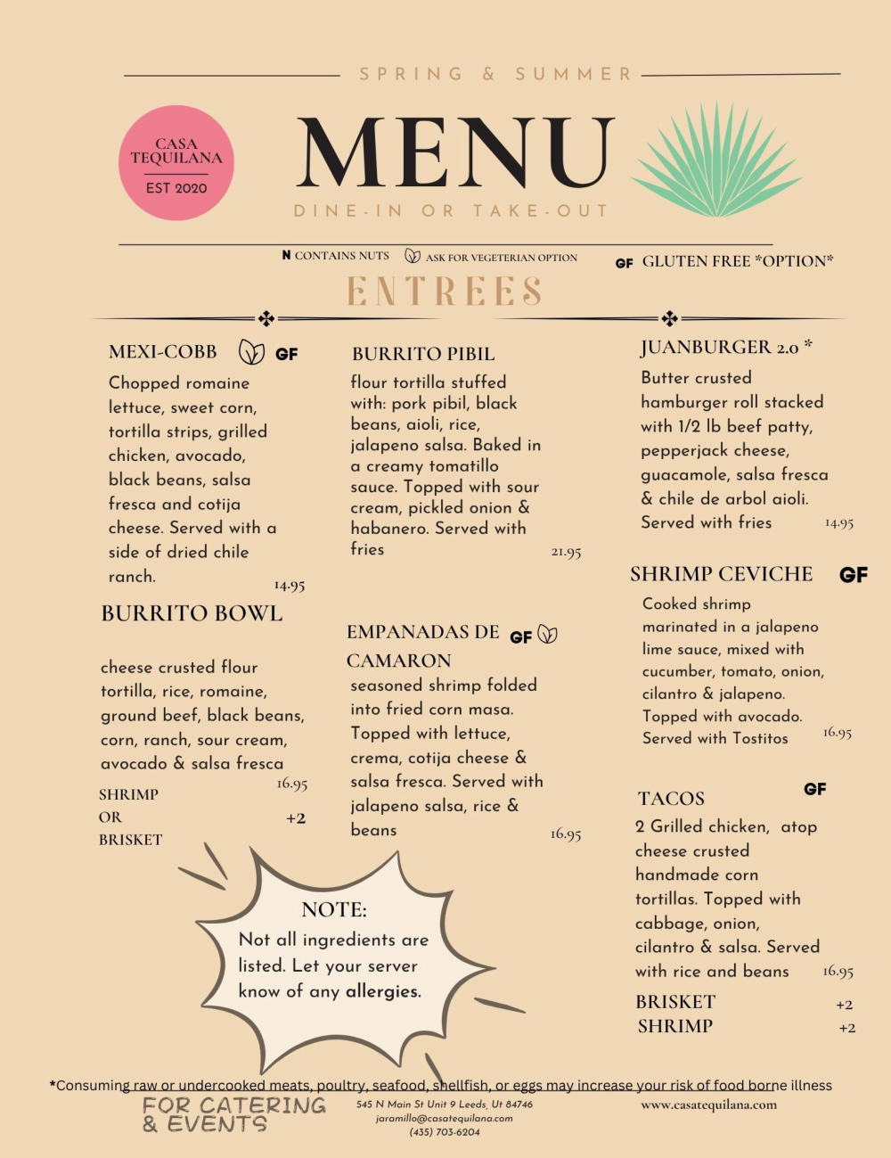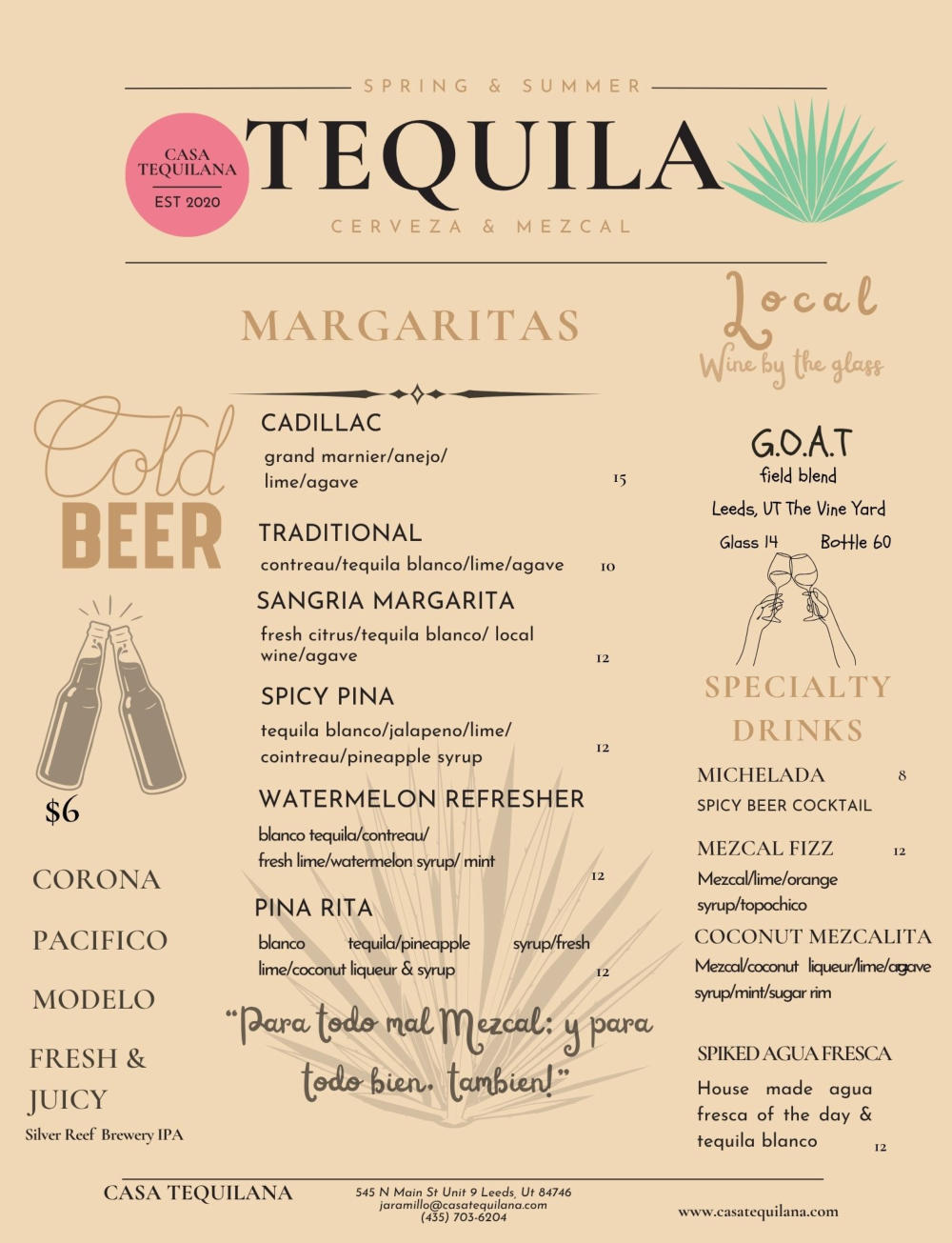 { "@context": "https://schema.org", "@type": "Restaurant", "name": "Casa Tequilana", "address": { "@type": "PostalAddress", "streetAddress": "545 N Main St #9", "addressLocality": "Leeds", "addressRegion": "UT", "postalCode": "84746", "addressCountry": "US" }, "telephone": "+1-435-703-6204", "openingHours": [ "Sun 10:00-14:00", "Mon 16:00-20:00", "Tue 16:00-20:00", "Wed 16:00-20:00", "Thu 16:00-20:00", "Fri 16:00-20:00", "Sat 11:30-21:00" ], "cuisine": "Mexican", "description": "Casa Tequilana offers authentic Mexican cuisine with delicious dishes like brisket tacos, smothered burritos, and fresh aguas frescas in Leeds, UT.", "menu": "https://order.toasttab.com/online/casa-tequilana-545-n-main-st", "image": "https://www.casatequilana.com/index_htm_files/15677.png", "url": "https://www.casatequilana.com/", "sameAs": [ "https://www.instagram.com/casatequilana/", "https://www.facebook.com/casatequilana/" ] }
